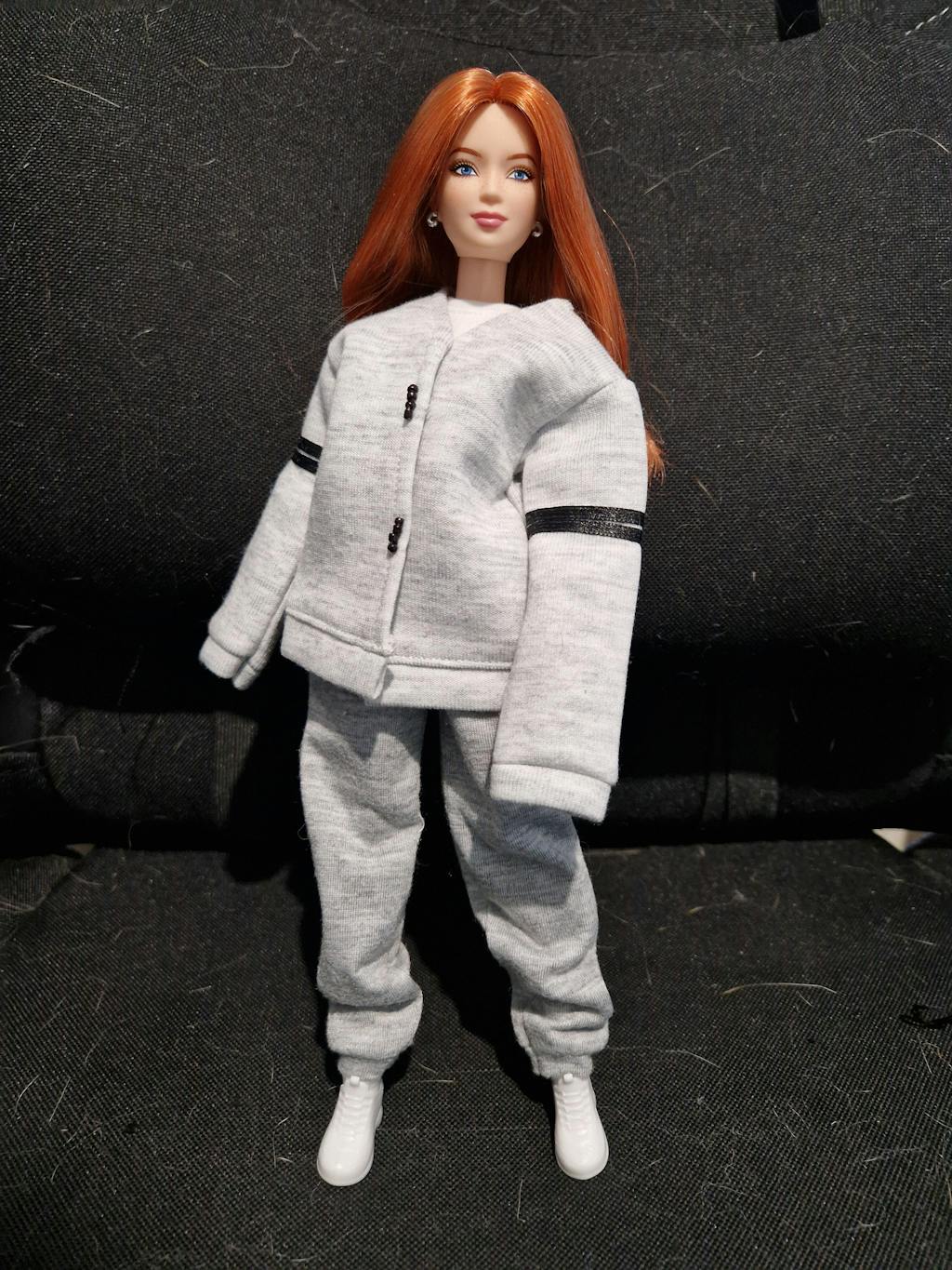 Elevate Barbie's street style with this layered casual set. Featuring a soft oversized cardigan with sporty stripes, black crop top, and distressed belted shorts. Perfect for a trendy fall look or chilly summer nights. Tailored for Barbie dolls with modern fashion taste.